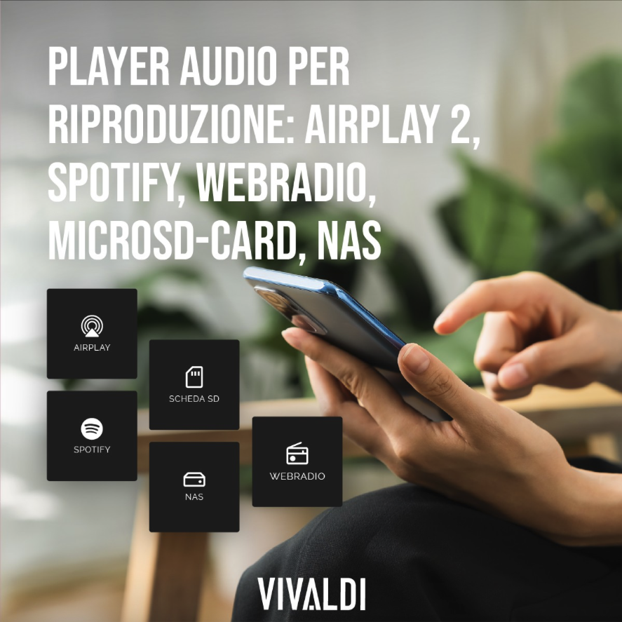 Integrati al dispositivo ci sono player audio per la riproduzione: AirPlay 2 (servizi di streaming audio. Ad esempio: YouTube, Apple Music, Amazon Music...), Spotify, Webradio, MicroSd-card, Nas |